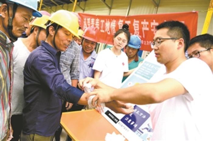 9月2日,江苏大学博爱青春团队的志愿者在为外来务工人员演示讲解伤口包扎方法。当日,志愿者来到江苏省镇江市金山水城社区辖区建设工地,向外来务工人员宣讲应急救护知识,指导农民工学习伤口包扎、心肺复苏等健康救护技能。 本报通讯员 石玉成 摄