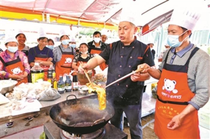 8月28日,重庆市丰都县南天湖镇梨地坪村40多名贫困群众在观摩鸡蛋饼的制作技术。今年以来,丰都县就业和人才中心三峡职业技工学校举办渝鲁技能帮扶培训班7期,对361名贫困劳动力进行中医理疗、烹饪等项目的技能培训,提高贫困劳动力的就业创业能力和增收致富的本领。