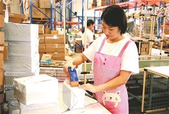 9月9日,在河北省邢台市南和区和阳镇一家宠物产品电商企业,工作人员打包发货。