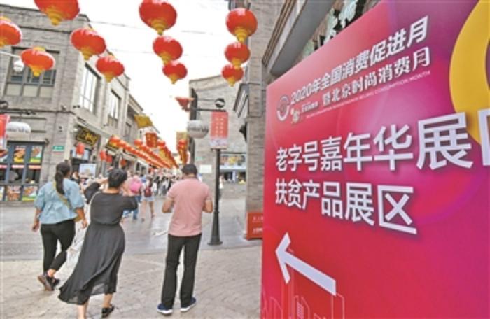 北京前门步行街近日迎来“2020年全国消费促进月暨北京时尚消费月”活动,来自国内30个国家级贫困县的重点扶贫产品和众多老字号产品,吸引大批北京市民及游客购买、品尝。