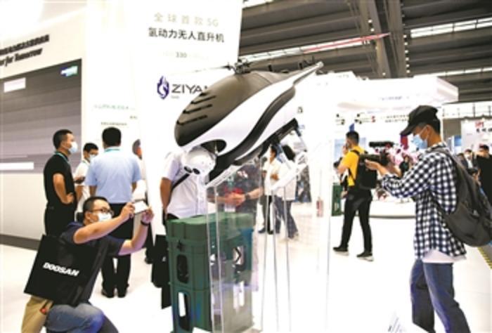 9月13日,人们在第四届世界无人机大会上参观一款氢动力无人直升机。当日,2020第四届世界无人机大会在深圳开幕,400多家国内外无人机企业带来1000多架无人机参展。 新华社记者 王丰 摄