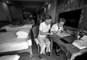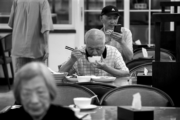 左图:9月9日,浙江省安吉县鄣吴镇幸福城康养社区的老人们在餐厅用餐。该社区的老人们大多数来自于上海、杭州等周边城市。