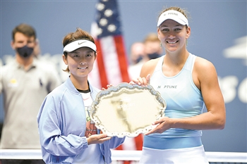 图为9月11日,徐一璠(左)与梅里查尔领取美网女双亚军奖杯。
