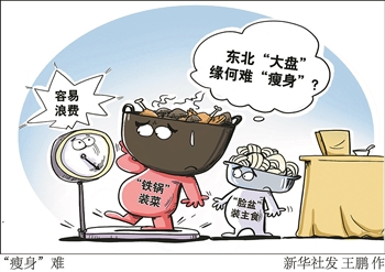 “大铁锅装小鸡炖蘑菇、猪肉炖粉条,脸盆大小的铝盆盛装堆积如小山的主食……在东北,有很多以“大盘菜”“大锅炖”为特色的餐馆。“新华视点”记者在吉林、黑龙江、辽宁三省走访发现,以“量大实惠”为招牌的东北菜在不少地方很受欢迎,但也存在剩菜多、浪费多的现象。 新华社发 王鹏 作