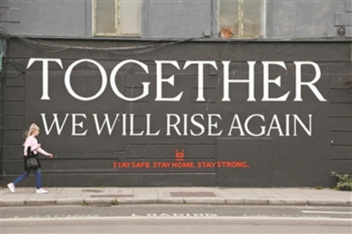 上图:9月19日,在爱尔兰首都都柏林,一名女子从抗疫标语前走过。爱尔兰总理米歇尔·马丁18日晚宣布,从当天午夜起,在首都都柏林地区启动3级疫情响应机制,以应对不断恶化的新冠疫情。