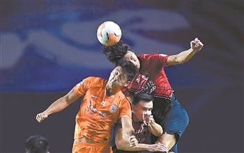 9月21日,深圳佳兆业队球员宋株熏(右上)在比赛中与山东鲁能泰山队球员郭田雨争顶。当日,在2020赛季中国足球协会超级联赛第一阶段(大连赛区)第12轮比赛中,山东鲁能泰山队以2比1战胜深圳佳兆业队。新华社记者 龙雷 摄