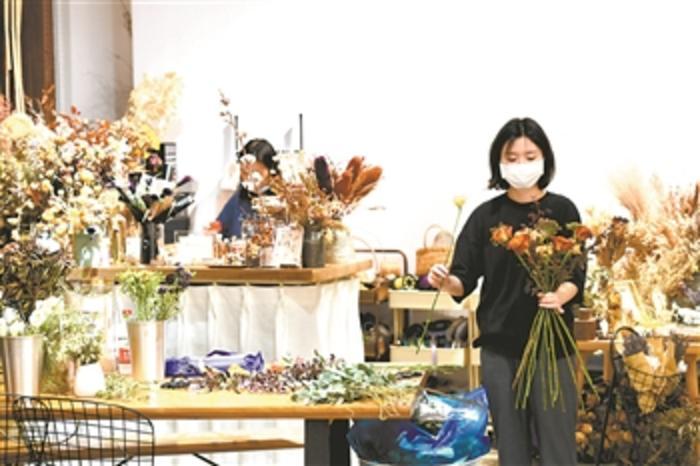 近日,在厦门市湖里区海峡设计文创园,花艺店工作人员在搭配花束。2016年,厦门湖里区启动创意产业园建设,一个个旧厂房被改造成文创“梦工厂”。截至今年7月,该创意产业园实现营收约14.8亿元,引进企业615家。