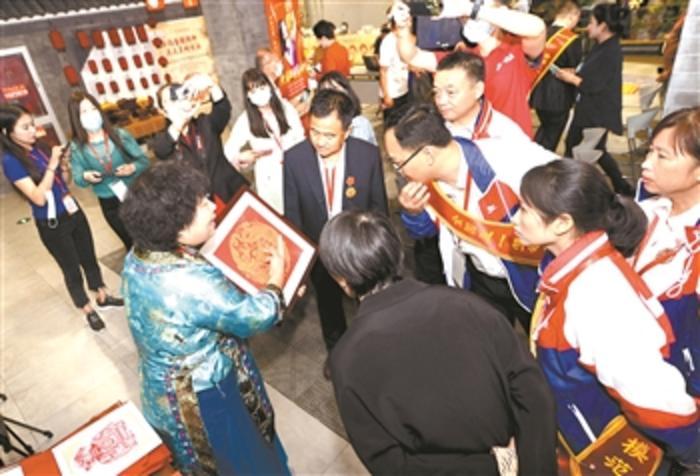 9月23日,剪纸艺术家石俊凤在北京长安商场内向大家展示剪纸作品。当日,石俊凤等非遗艺术家,与长安社区居民和青年学生一起,分享艺术的精妙,同时推介劳模创新成果,弘扬劳模精神和工匠精神。