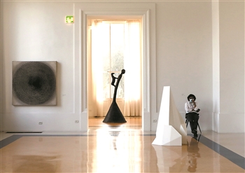 9月22日,一名工作人员在意大利罗马国立现代及当代艺术美术馆内监督参观者保持社交距离。