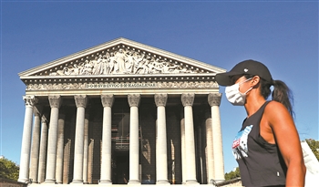 9月22日,一名女子戴口罩走过法国巴黎马德兰教堂。