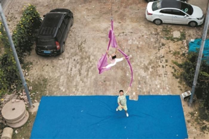 下图为一对夫妻正在家门口排练双人绸吊,为即将到来的“十一”演出季做准备。