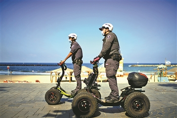 这是9月25日在以色列特拉维夫拍摄的在海滩巡逻的警察。 以色列从25日14时开始实施更为严格的全面“封城”措施,为期两周。 新华社/基尼图片社
