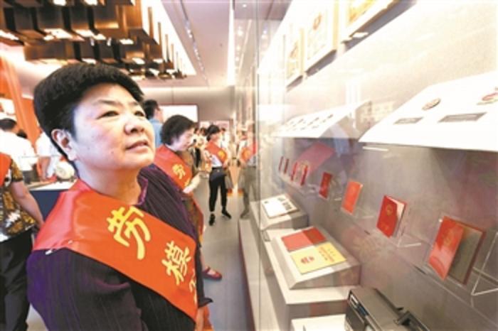 9月26日,杭州市“工匠日”,劳模工匠与各界代表正在参观展陈的各类奖章等实物。当日,杭州工运史资料陈列室暨劳模工匠展示厅在市工人文化宫开馆。 李忠 摄/人民图片