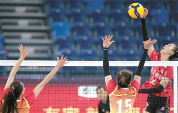 9月28日,江苏中天钢铁队球员张常宁(上)在比赛中扣球。当日,在广东江门举行的2020年全国女排锦标赛第一阶段A组第六轮比赛中,江苏中天钢铁队以3比0战胜北京汽车队。 新华社记者 秦朗 摄