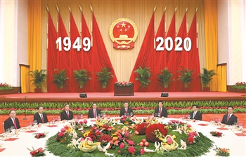 人民大会堂宴会厅鲜花绽放,洋溢着热烈喜庆的节日气氛。主席台上方,庄严的国徽高悬,“1949-2020”的大字年号在鲜艳的红旗映衬下格外醒目。
