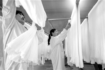 9月28日,陕西省靖边县宋渠村桑蚕养殖园内,工人们正为迎接“十一”消费季忙碌着,图为几名妇女正在晾晒蚕丝。2018年,该村为提高村民收入,吸引剩余劳动力回村就业,在多方考察之后,成立了该养殖园。2020年,养殖园共提供务工岗位25个,吸纳劳动力100余个。未来,随着养殖规模的日益扩大和产业链的拓展,可提供50余个稳定就业岗位,吸纳1000余个劳动力务工,进而实现当地村民就地就近稳定务工。本报记者 王伟伟 摄