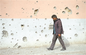 在阿塞拜疆临近纳卡边境的塔塔尔地区,一名村民从布满弹孔的墙壁旁经过。