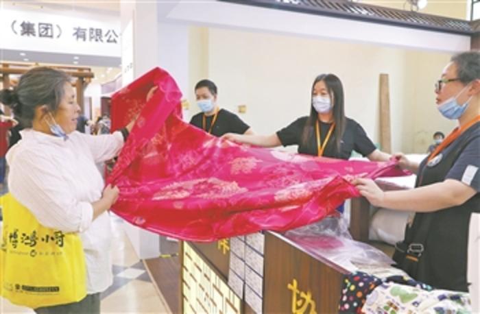 10月10日,一名参观者在一老字号展位前挑选布料。