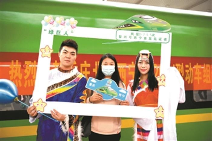 10月11日,在重庆北站,搭乘重庆北至西宁首趟“绿巨人”复兴号动车的旅客(中)与工作人员在发车前合影。该动车组列车是有着“绿巨人”之称的新型时速160公里动力集中动车组。 新华社记者 唐奕 摄