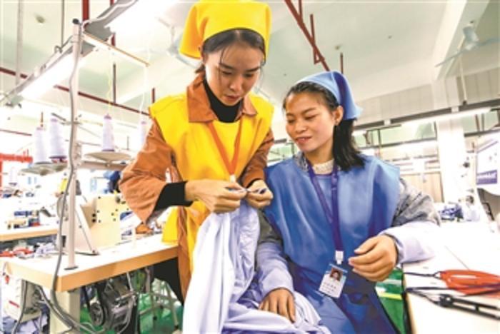 10月10日,贵州省铜仁市玉屏侗族自治县一家服装生产企业员工在车间内工作。今年以来,该县以稳定劳动密集型企业生产为抓手,加强信贷支持、降低融资成本、部门跟踪服务等多措并举对企业进行帮扶,帮助企业恢复正常产能,稳就业保民生。 本报通讯员 胡攀学 摄