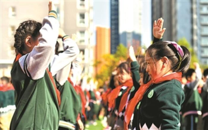 10月12日,石家庄市育新实验小学举行少先队新队员入队仪式,新老队员互敬队礼。当日,河北省石家庄市部分小学为少先队新队员举行了庄严隆重的入队仪式,以此迎接中国少年先锋队建队纪念日的到来。 新华社发 (张晓峰 摄)