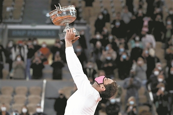 10月11日,在2020法国网球公开赛男单决赛中,“红土之王”纳达尔横扫头号种子焦科维奇,第13次在罗兰加洛斯加冕男单冠军,并追平了瑞士人费德勒保持的20次大满贯夺冠的男子纪录。图为纳达尔在颁奖仪式上高举奖杯庆祝。