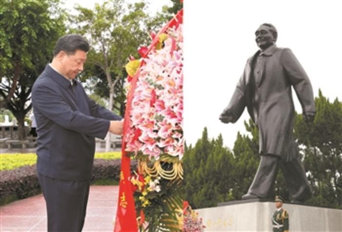 当天下午,习近平来到莲花山公园,向邓小平同志铜像敬献花篮。习近平缓步走上铜像基座,仔细整理花篮上的红色缎带,同大家一起向铜像三鞠躬,表达对邓小平同志的崇高敬意和深切缅怀。