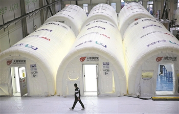 10月14日,在山东自贸区青岛片区中德生态园,历经3天的升级扩建后,青岛华大“火眼”实验室完成升级扩建,并于当晚投入使用。至此,该实验室每日核酸检测通量可实现40万人份。扩建的青岛华大“火眼”实验室,由9个气膜版“火眼”实验室组成。本报通讯员 张进刚 摄
