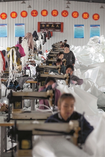 10月10日,在山西和顺县扶贫产业园区,李世清向第一天上班的表妹传授编织袋加工技巧。家住园区附近的李事清在此上班两年,每月能有3000多元的收入,她所在的英明塑料包装有限公司是全国总工会产业扶持项目。“党建带工建,同心促脱贫”等标语在车间随处可见。