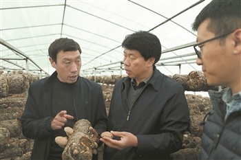 10月12日,全总驻壶关扶贫工作队队长陈伶浪(图中)和队员冀永宏(右一)在香菇生产基地了解企业生产情况。
