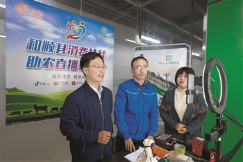 10月12日,全总驻和顺扶贫工作队队长贾海涛(左一)在网上“直播带货”,推介和顺扶贫农产品。