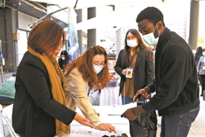 10月18日,在2020未来人才集市活动现场,一名外籍应聘者(右一)向一家企业的工作人员递交简历。