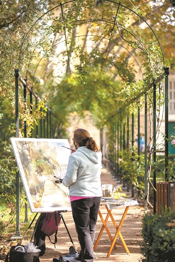 10月17日,在西班牙马德里卡普里乔公园,画家进行创作。卡普里乔公园坐落在马德里东北部,建于18世纪末到19世纪上半叶,是马德里现存唯一一个浪漫主义时期的公园,被认为是马德里最美公园之一。新华社记者 孟鼎博 摄