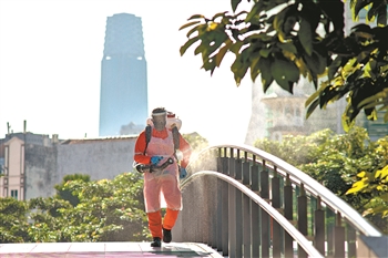 ③10月17日,工作人员在马来西亚吉隆坡独立广场附近喷洒消毒液。马来西亚卫生部17日发布的新冠疫情数据显示,该国过去24小时新增确诊病例创疫情以来单日新增病例数新高。新华社发(张纹综 摄)