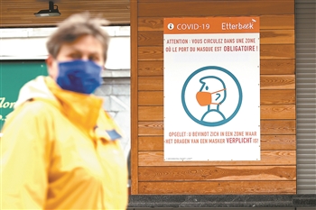 ②10月17日,在比利时布鲁塞尔,行人经过一处提示佩戴口罩的标识牌。比利时首相德克罗在16日举行的记者会上宣布,为遏制正在出现的第二波新冠疫情,比利时决定自19日起在全国范围内实施宵禁。新华社记者 张铖 摄