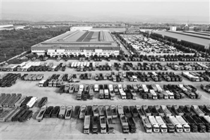 10月18日,河南三门峡市,俯瞰河南骏通车辆有限公司一角,千余辆生产一新的车辆整装待发。该公司是一家集专用车研发、制造、销售于一体的综合性民营企业。经过多年的探索发展,产品有200多款,主要销往全国20多个省、市(自治区),并批量出口到中亚、非洲、南美洲、东南亚等地区。孙猛 摄/人民图片