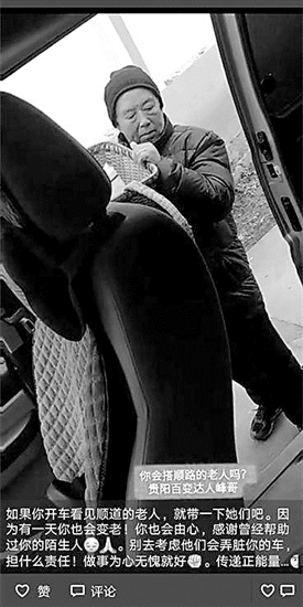 “如果你开车看见顺道的老人,带一下他们吧,因为有一天你也会变老。”最近,在贵州贵阳,有个叫史峰的私家车主火了。每次经过乡村道路,看见行走赶集的老人,他都会免费搭载他们。5年间,他免费搭载老人近300次。