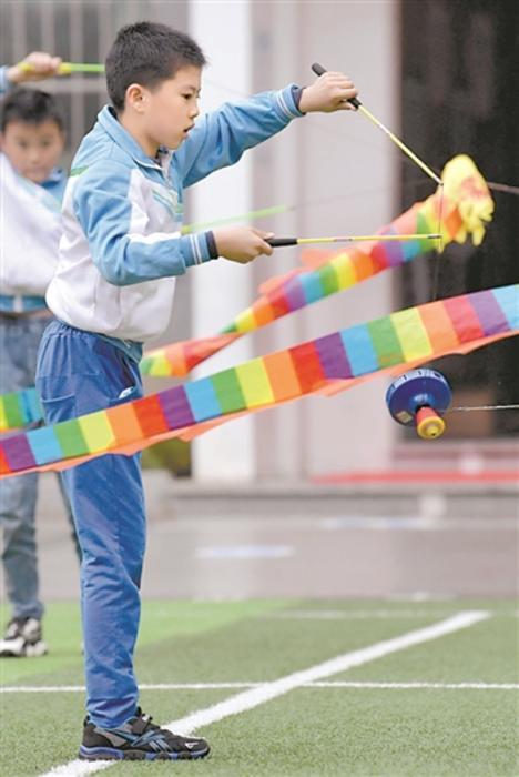 10月19日,在江西省南昌市东湖区向荣小学,学生在练习抖空竹。