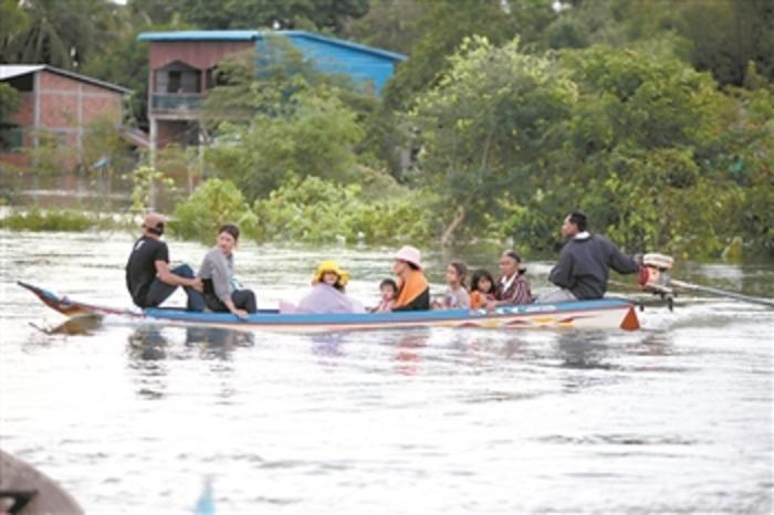10月21日,柬埔寨班迭棉吉省的受灾群众坐在救生艇上。柬埔寨首相洪森21日在柬西北部班迭棉吉省表示,近期洪灾已导致柬34人丧生。新华社发(李莱 摄)