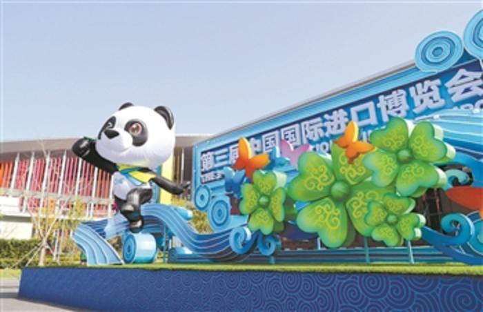 国家会展中心(上海)西入口处摆放的熊猫“进宝”主题进博会装饰。
