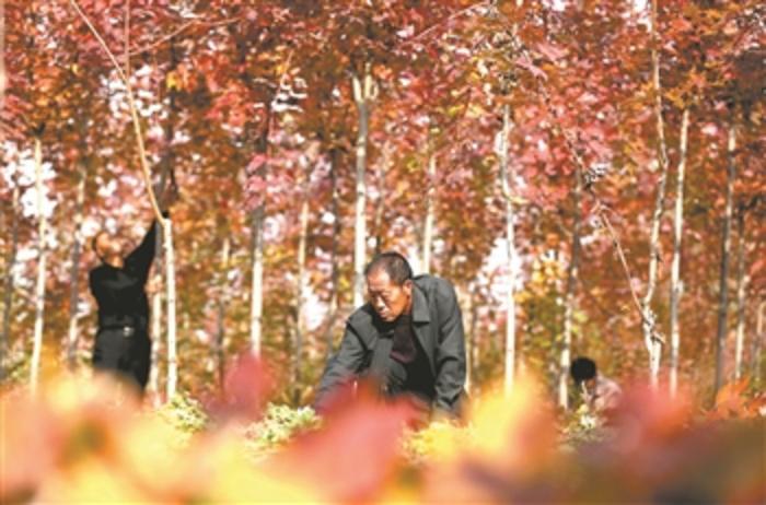 10月25日,河北遵化市铁厂镇铁厂村的村民正在给红枫树去除多余的枝干。