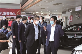东风汽车有限公司党委书记、工会主席赵书良(右一)参加东风日产乘用车公司佛山利泰专营店党支部“拥抱客户”党建品牌创建活动。