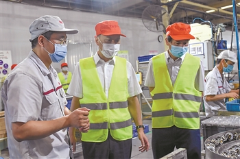 东风汽车集团有限公司总经理助理、东风汽车有限公司执行副总裁、党委委员周先鹏(中)在东风富士汤姆森公司检查安全生产情况。