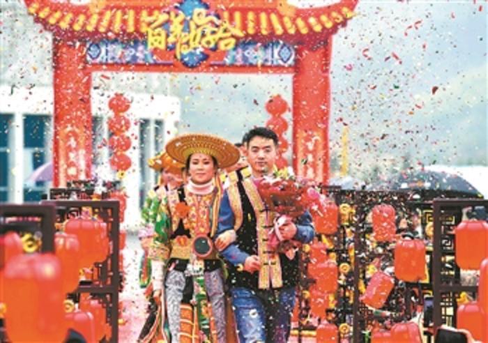 当日,隆回县举行扶贫脱单集体婚礼,32对新人参加了婚礼。隆回县是湖南典型的老少边穷地区,以前这里流传着“有女不嫁瑶山汉”的老话。近年来,该县因地制宜发展产业,走出了一条可持续、高质量的脱贫致富之路,成为湖南省脱贫攻坚先进县,面貌焕然一新。 本报通讯员 郭立亮 摄