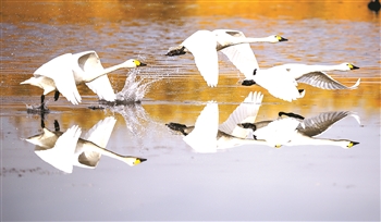 10月28日,天鹅在乌梁素海水面上飞翔。