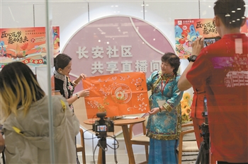 9月23日,丰宁满族剪纸非遗传承人石俊凤(右二)在北京市长安商场内的直播间展示剪纸作品。