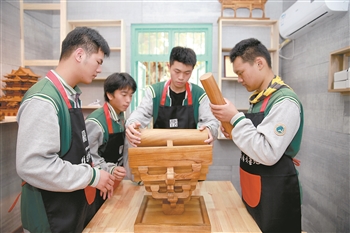 10月29日,浙江省“东阳市非遗青创基地”内,同学们在学习卢宅古建营造技艺。当日,“东阳市非遗青创基地开园仪式”在浙江省东阳市职业教育中心学校东技校区举行。