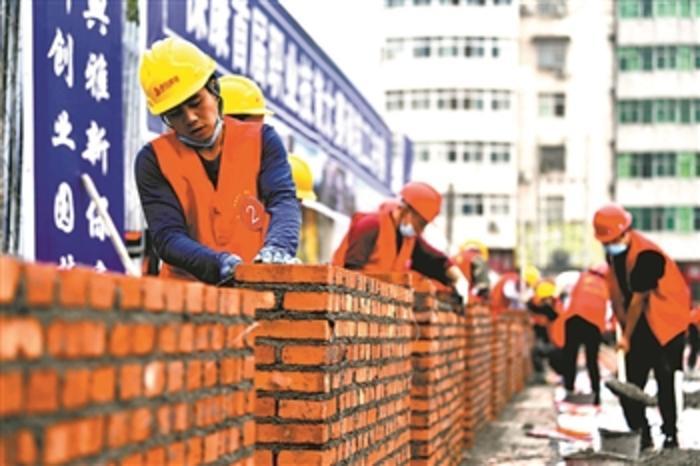 10月30日,湖北省襄阳市保康县首届职业技能大赛总决赛在保康县体育场举行,来自全县的50多名选手参加了制茶、雕刻、烹饪、导游、砌筑5个项目的比赛。图为参赛选手正在进行砌筑比赛。本报通讯员 杨韬 摄