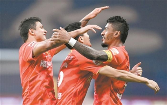 11月2日,广州恒大淘宝队球员保利尼奥(右)在比赛中进球后与队友庆祝。当日,在2020赛季中国足球协会超级联赛(苏州赛区)第18轮比赛中,广州恒大淘宝队以3比1战胜北京中赫国安队,从而以两回合总比分3比1晋级决赛。
