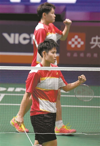 11月2日,福建一队组合谭宁/黄东萍(前)在甲组女子团体决赛中庆祝得分。她们以2比0战胜上海一队组合林芳灵/周芯如。当日,在陕西省宝鸡市举行的2020年全国羽毛球锦标赛甲组女子团体决赛中,福建一队以3比1战胜上海一队,夺得冠军。新华社记者 李一博 摄